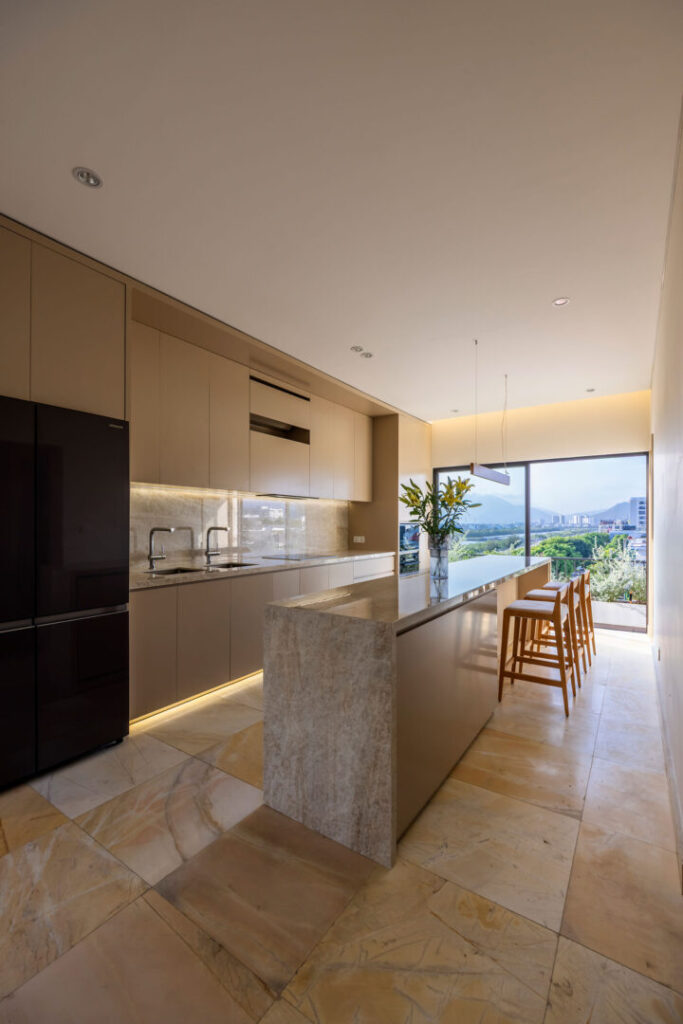 The interior of VCN Nha Trang House is a perfect blend of modern, minimalist design and comfort, creating a luxurious living space. From the living room overlooking the skylight to the kitchen with a serene river view, and the elevated bathroom surrounded by lush greenery, each area is designed to offer a living experience close to nature while ensuring maximum convenience.